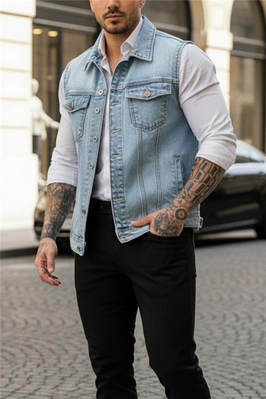 - Praktični muški prsluk širokog kroja u svijetloplavoj boji, pogodan za razne modne kombinacije.