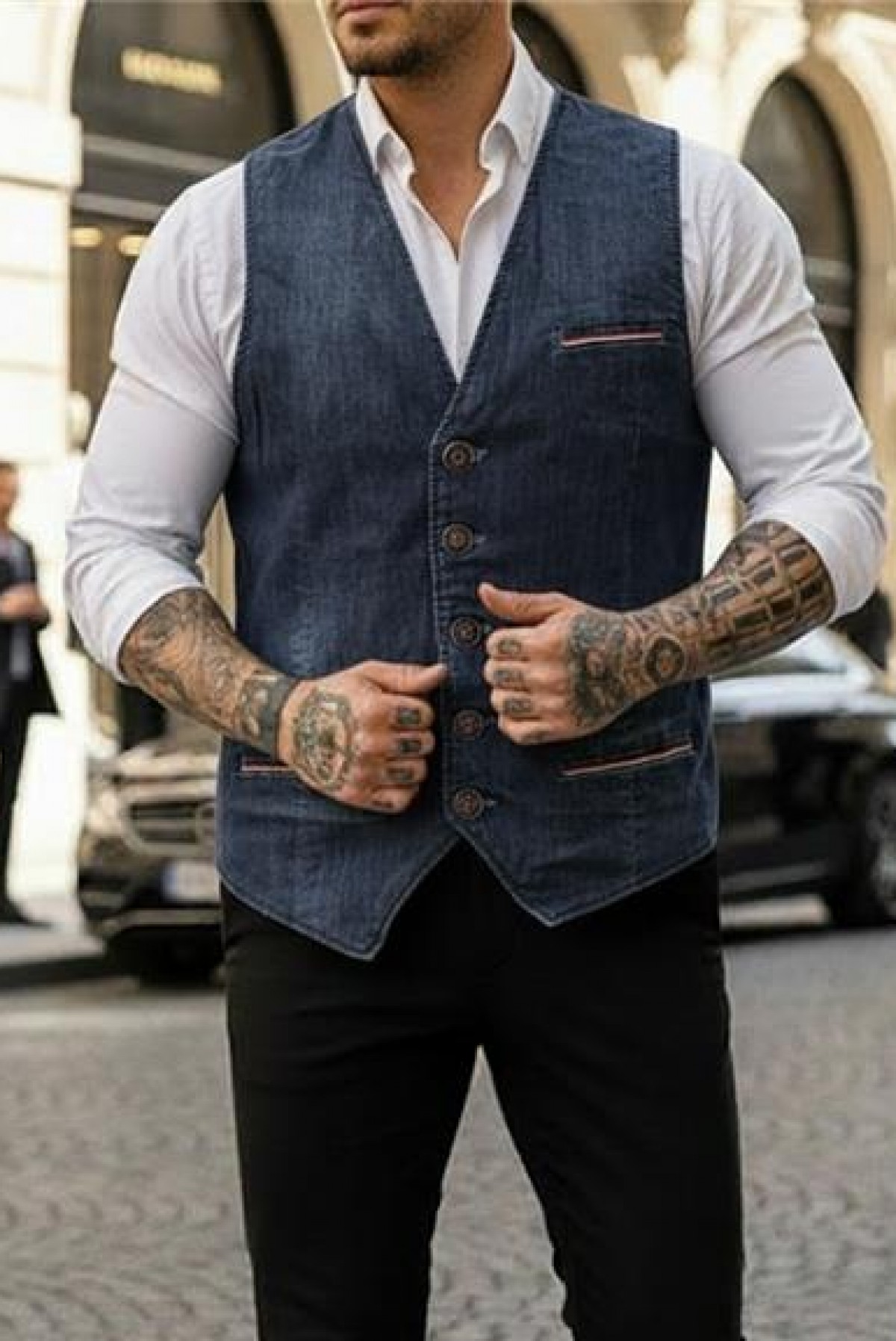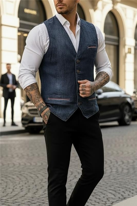 - Praktičan muški prsluk širokog kroja u tamnoplavoj boji, pogodan za razne modne kombinacije.