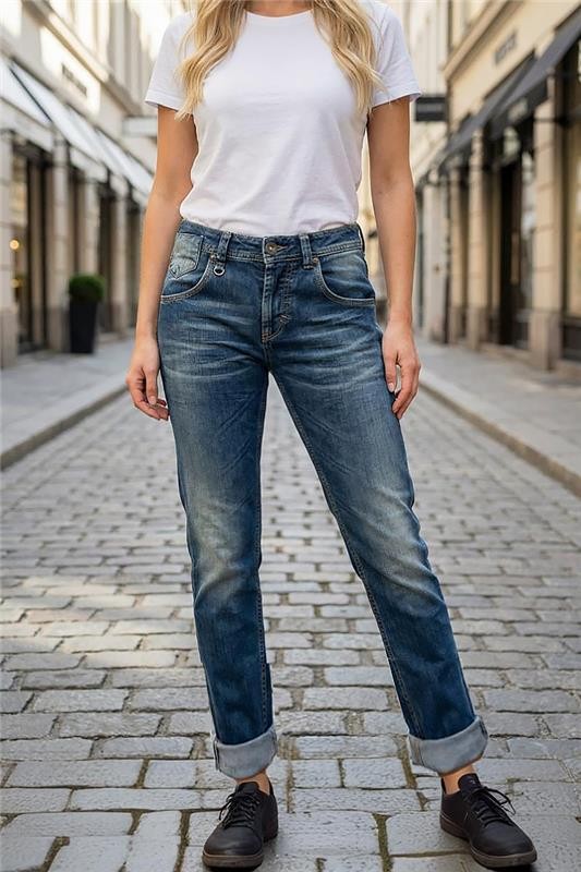 - Osnovni model ženskih traperica u plavoj boji s izbijeljenim efektom, prikladan za svakodnevni život ili šetnju.
