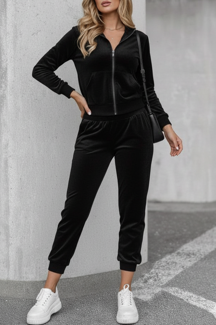 - Dukserica ima patentni zatvarač i kapuljaču, a hlače visoki struk i bočne džepove.