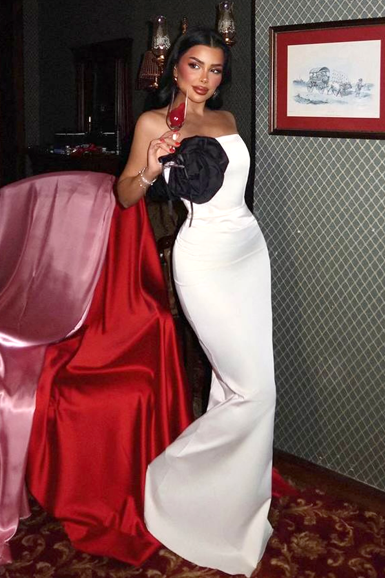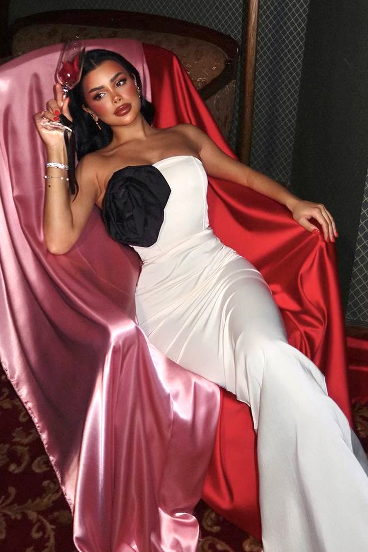 - Elegantna duga haljina u klasičnoj bijeloj boji s 3D cvjetnim naglaskom na vrhu, prikladna za svečane prigode i koktele.