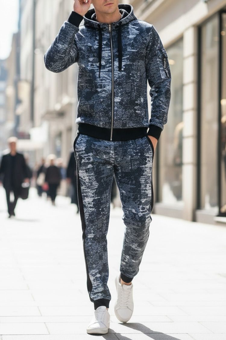 - Udoban muški dvodijelni set s nestandardnim uzorkom, koji se sastoji od dukserice s vezicama i hlača.