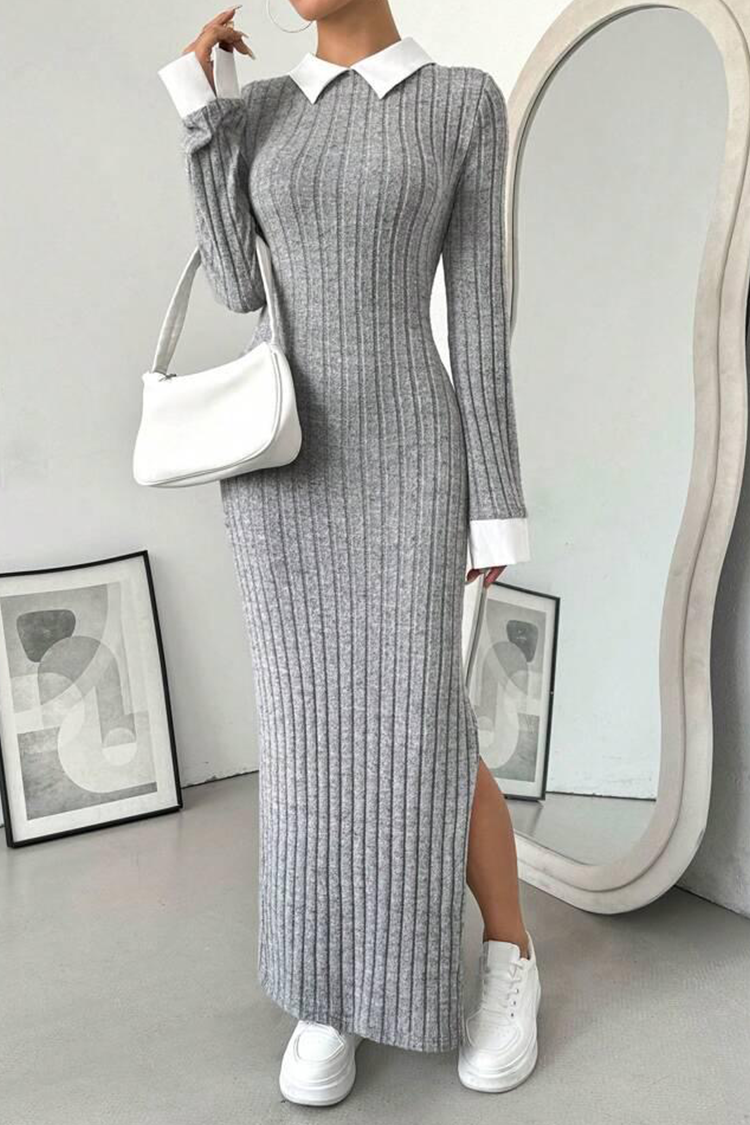 - Model ima pripijeni kroj, duge rukave, jednobojni uzorak, seksi prorez i spektakularan bijeli ovratnik.