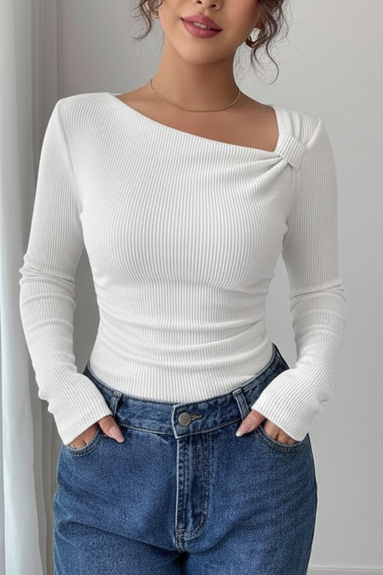 - Model ima duge rukave, pripijeni kroj, jednobojni uzorak i asimetrični dekolte.
