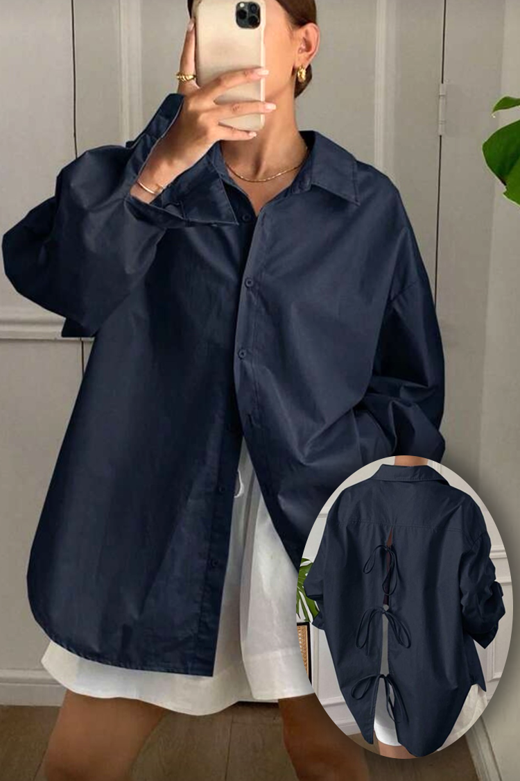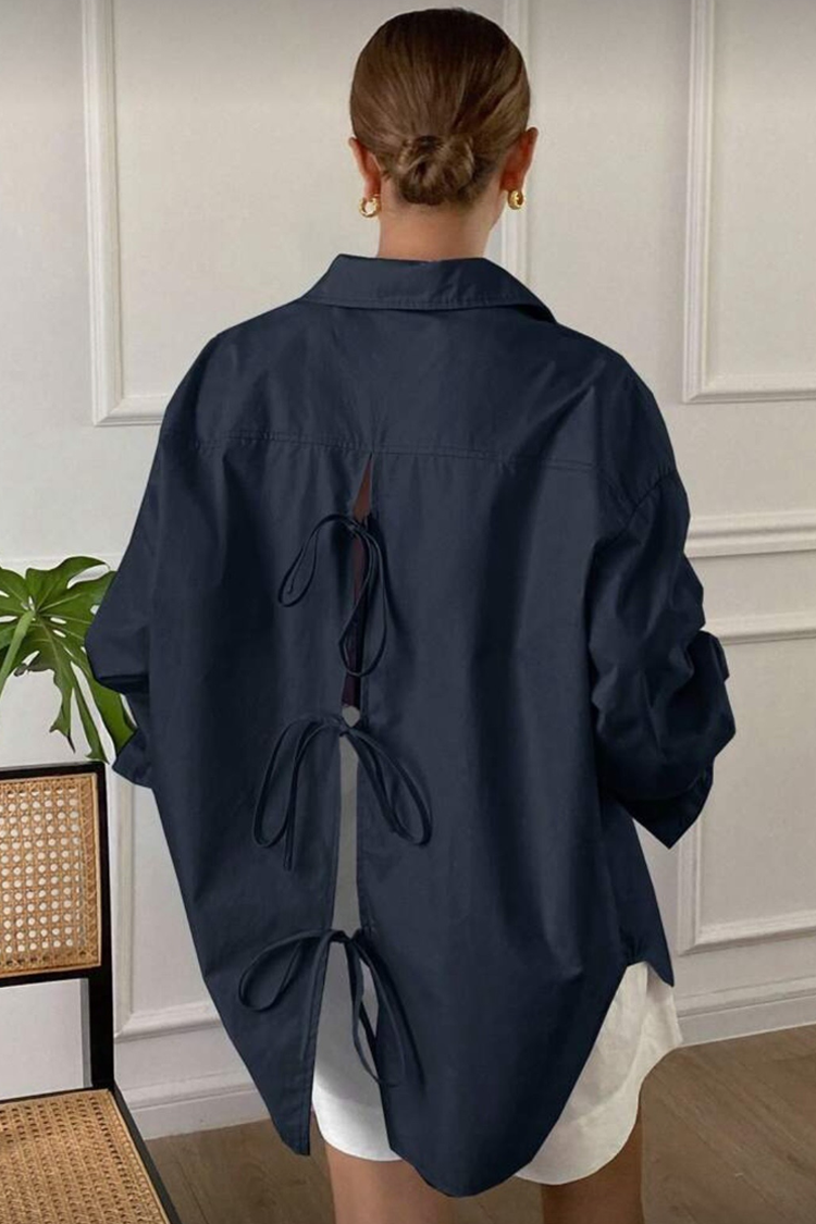 - Model ima duge rukave, oversized kroj, kopča se gumbima sprijeda i spektakularna leđa s ukrasnim vrpcama.
