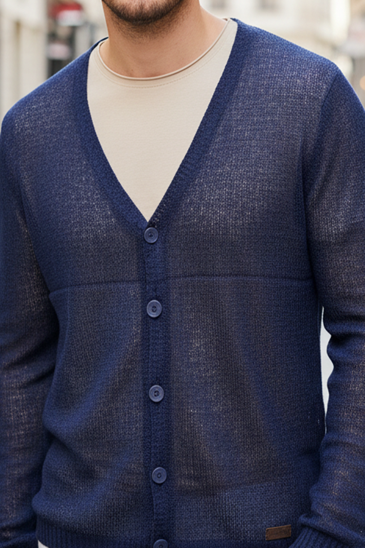 - Muški kardigan elegantnog dizajna u tamnoplavoj boji, pogodan za razne modne kombinacije.