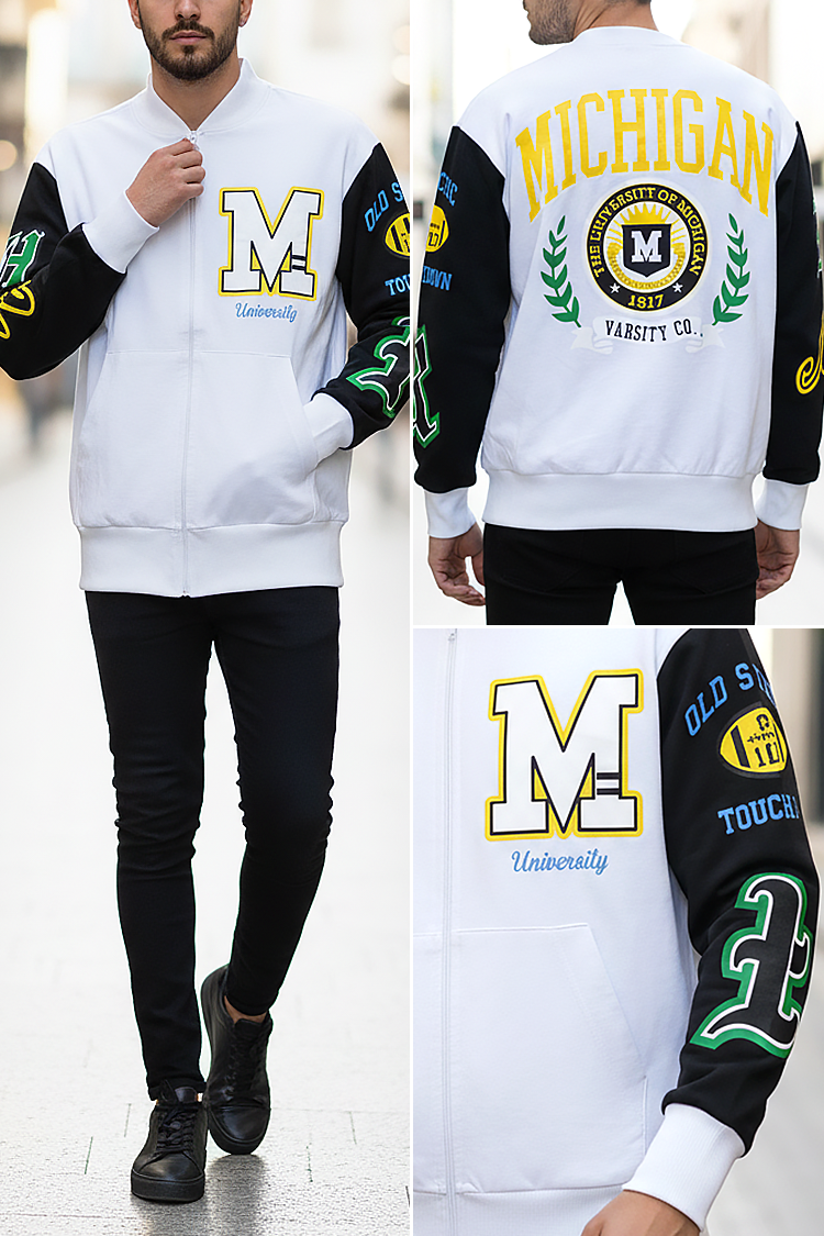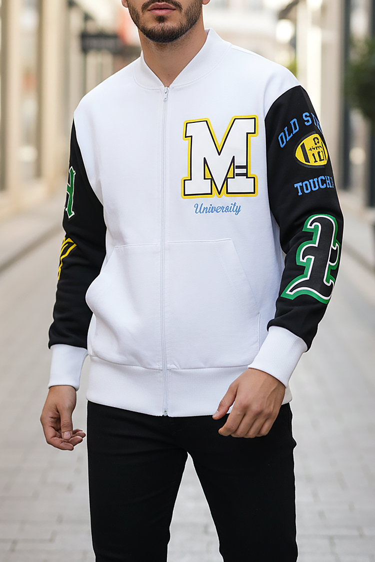 - Moderna muška dukserica s džepovima u bijeloj boji i spektakularnim printom na rukavima i leđima, prikladna za svakodnevni život, sport ili šetnju.