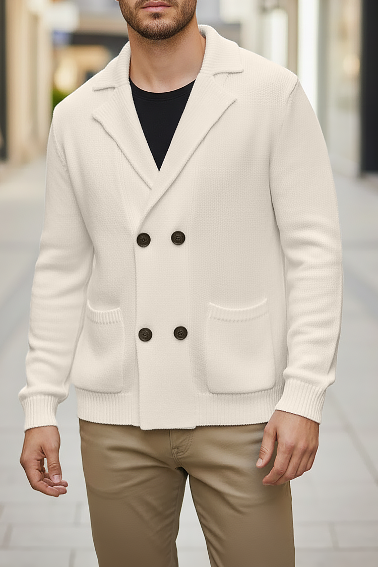 - Elegantni muški kardigan s ovratnikom i dvostrukim kopčanjem u ecru boji, pogodan za razne modne kombinacije.