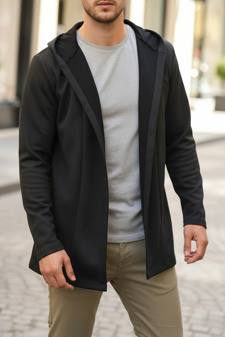 - Moderan i funkcionalan muški kardigan s kapuljačom u crnoj boji, prikladan za svakodnevni život.