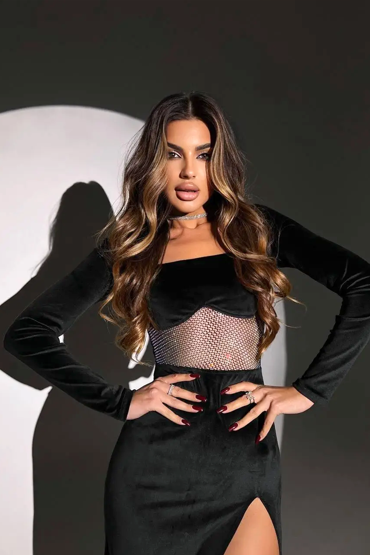 - Model je midi duljine, crne boje, baršunastog efekta, pripijenog kroja i visokog proreza sa strane.