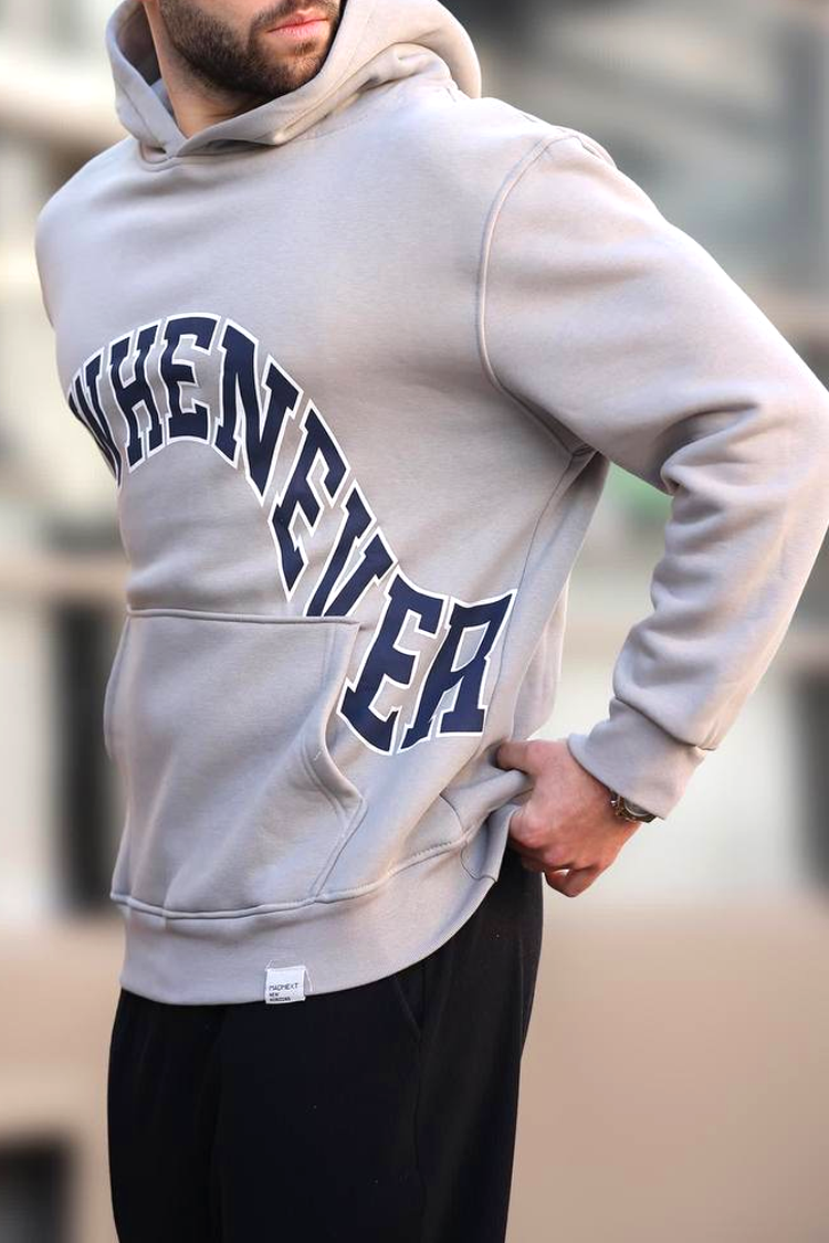 - Praktična muška dukserica s kapuljačom u sivoj boji s prepoznatljivim, kontrastnim natpisom, prikladna za svakodnevni život ili šetnju.