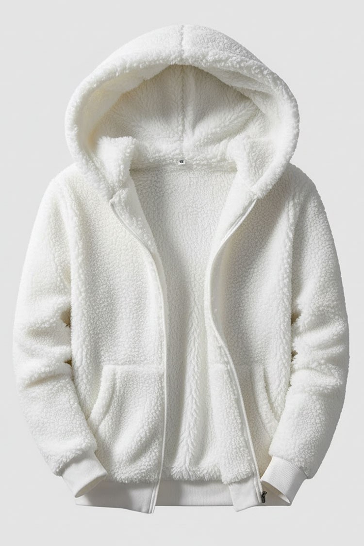 - Muška flis dukserica s elastičnim manžetama, džepovima i kapuljačom u klasičnoj bijeloj boji.