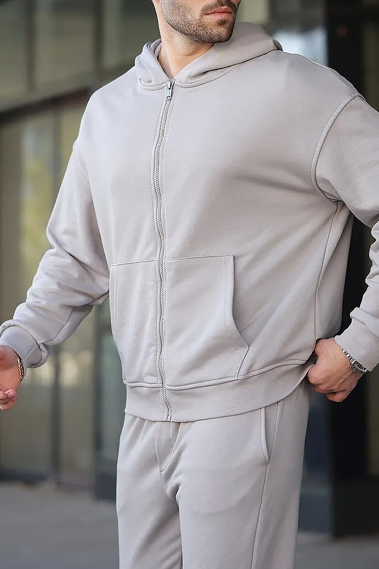 - Udoban dvodijelni sportski set koji se sastoji od dukserice s kapuljačom i hlača s džepovima u sivoj boji.