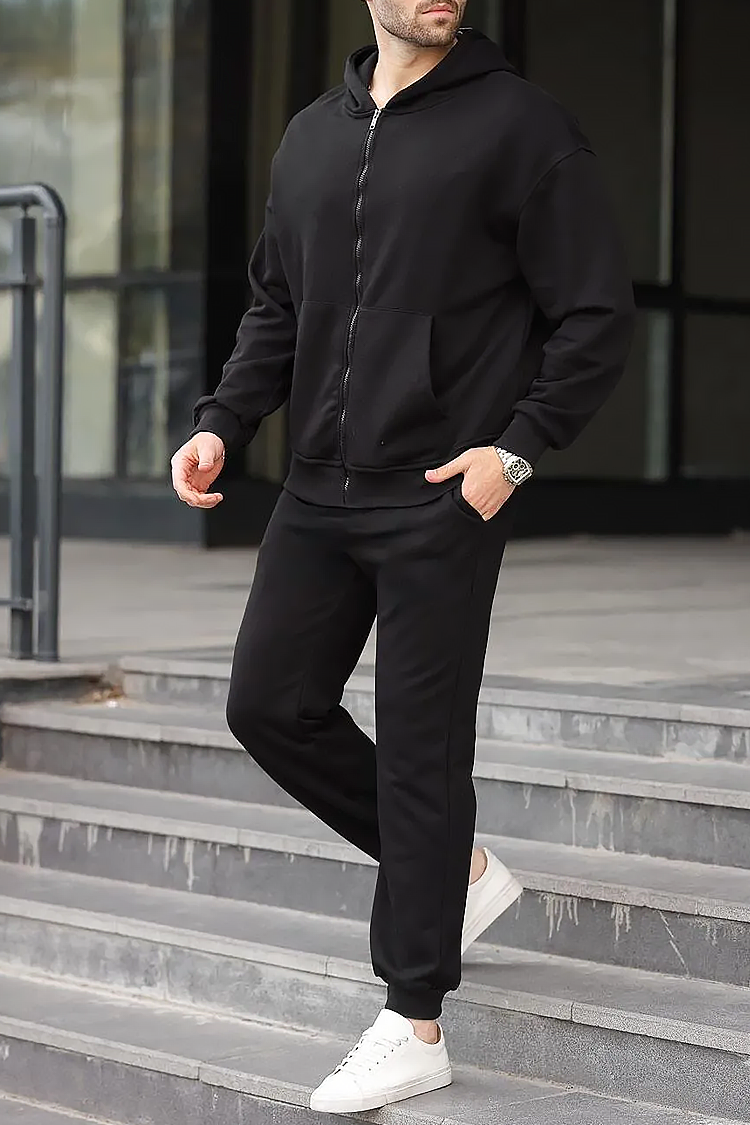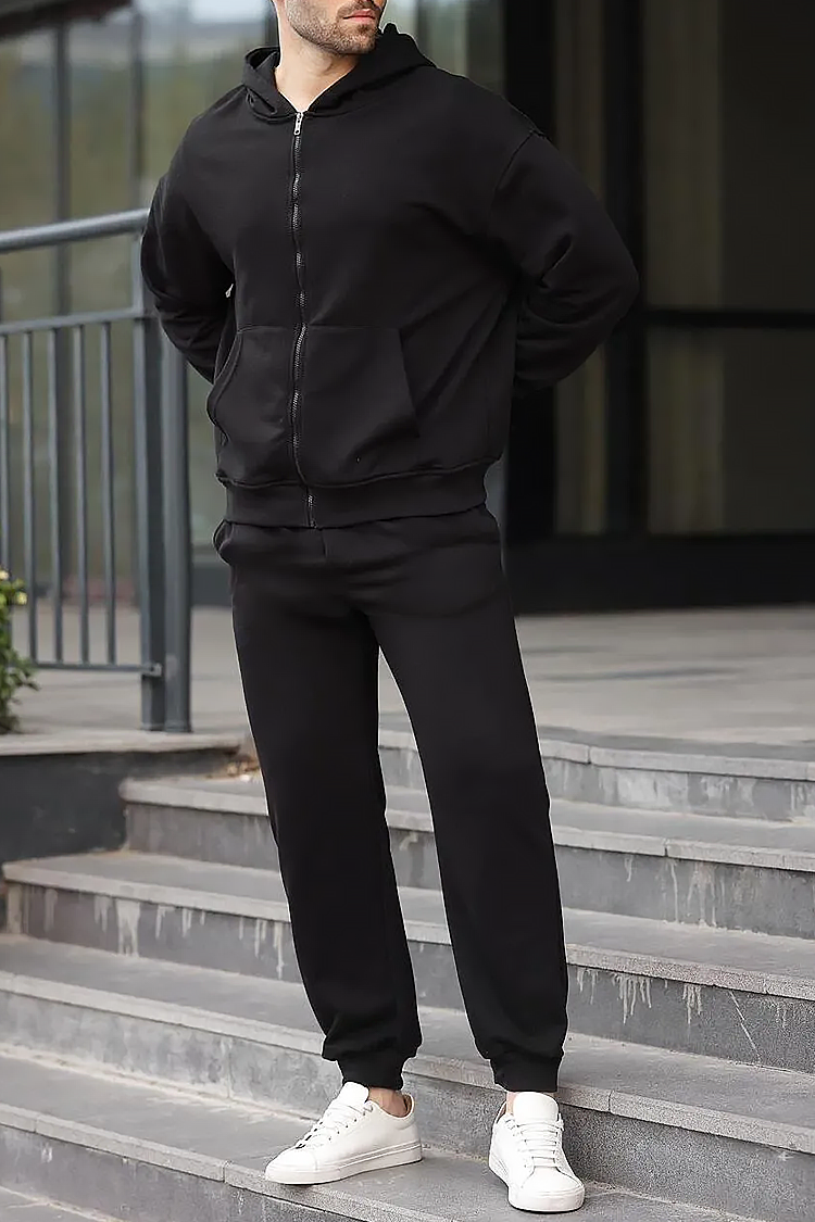 - Udoban dvodijelni sportski set koji se sastoji od dukserice s kapuljačom i hlača s džepovima u crnoj boji.