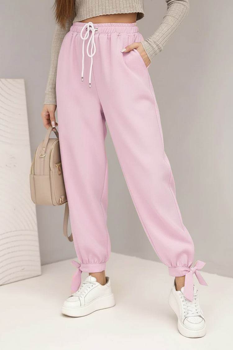 - Model ima elastični struk s vezicama i dodatnim vezicama na kraju nogavica.