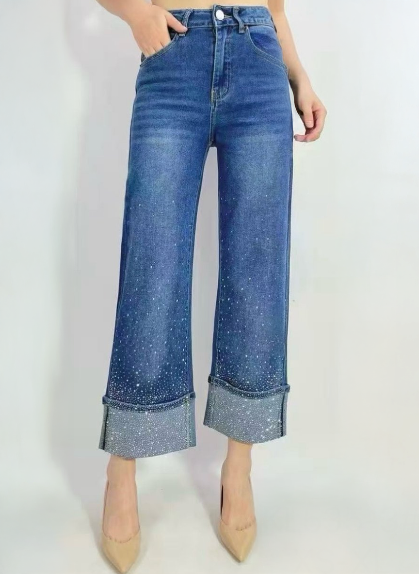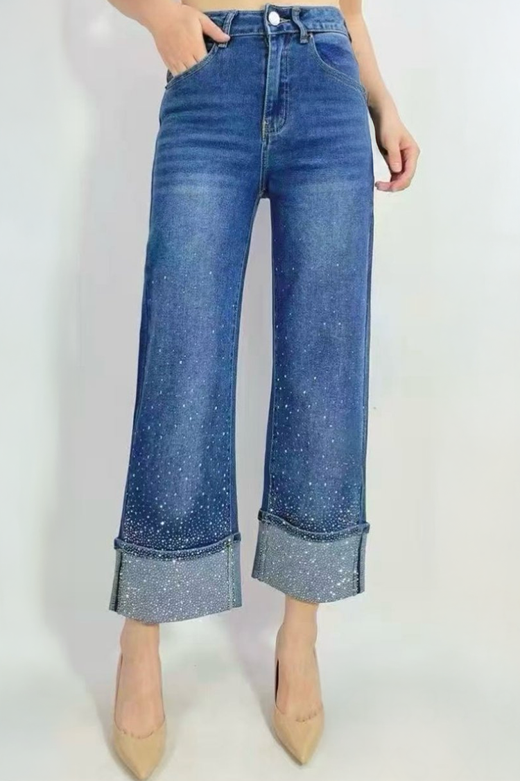 - Model ima visoki struk, široke i podvijene nogavice te kamenčiće.