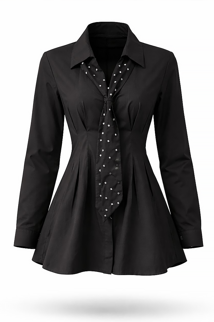 - Model ima čistu liniju, pripijeni dizajn, ovratnik i kravatu s uzorkom točkica.