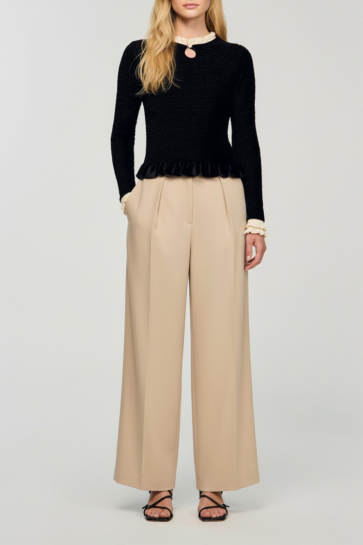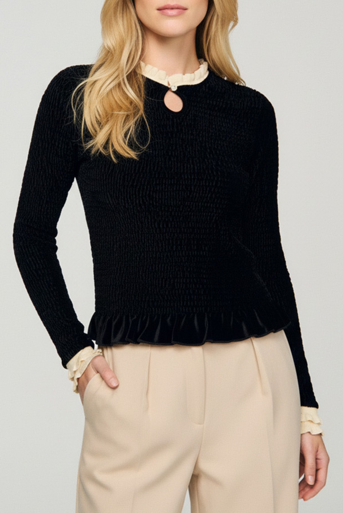 - Elegantna ženska bluza, koja kombinira klasičnu crnu s nježnim bež detaljima.