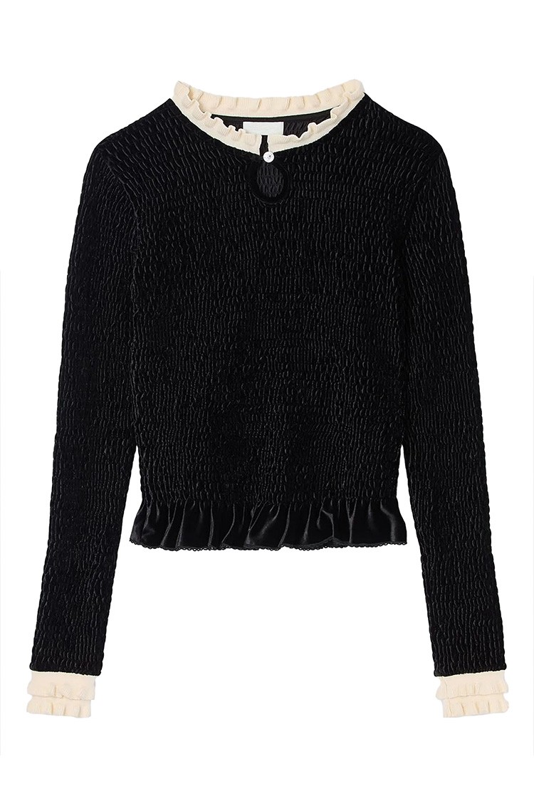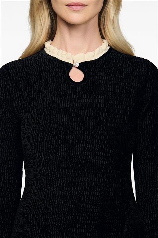 - Model se ističe finim reljefom tkanine, ukrasnim otvorom na dekolteu i elegantnim kovrčama na ovratniku.