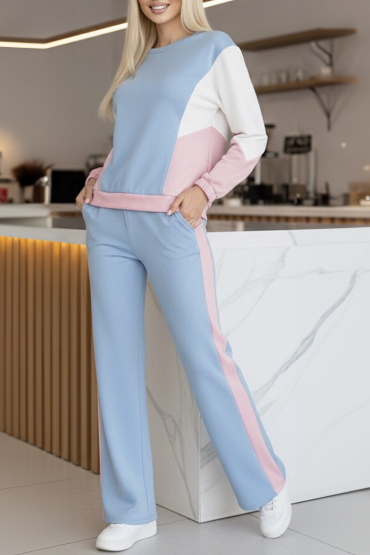 - Bluza ima okrugli izrez i udoban kroj, a donji dio - s visokim strukom i dugim nogavicama.