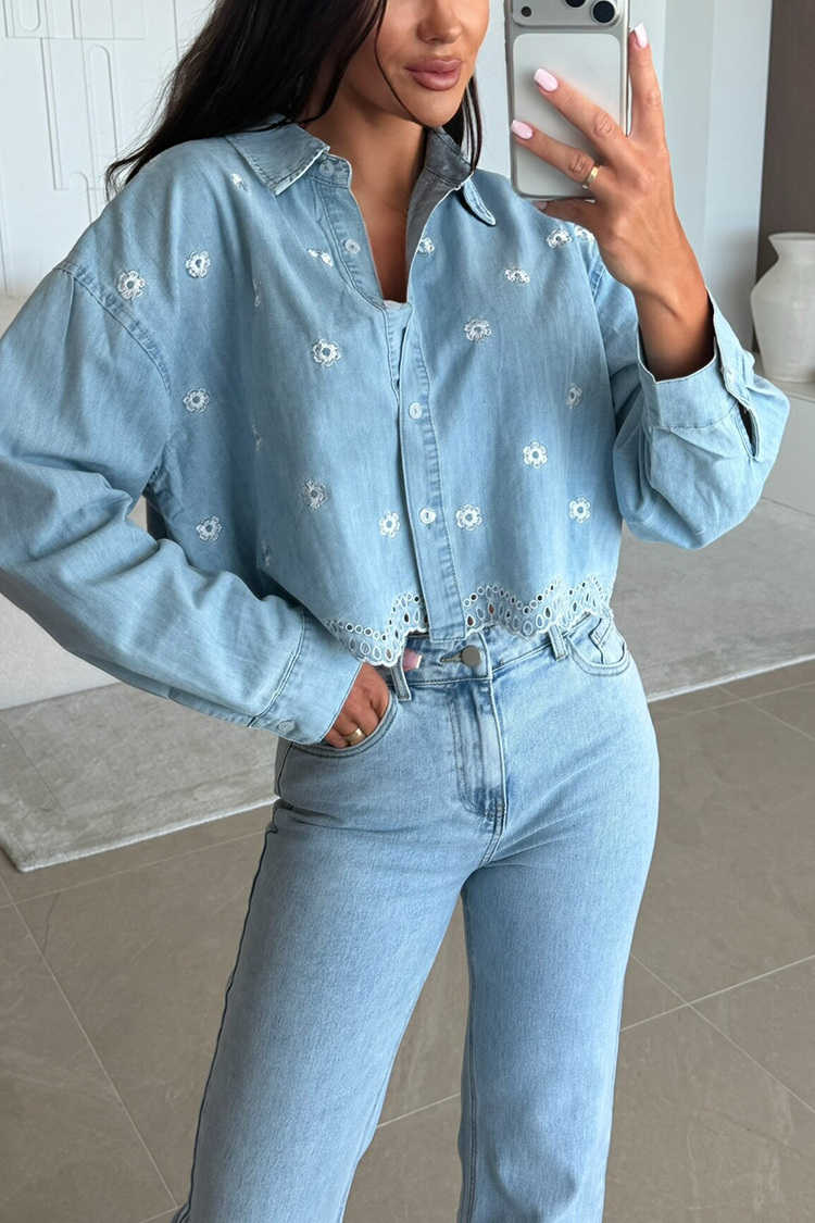 - Model ima duge rukave, ovratnik, kopča se gumbom i ima atraktivan cvjetni uzorak.
