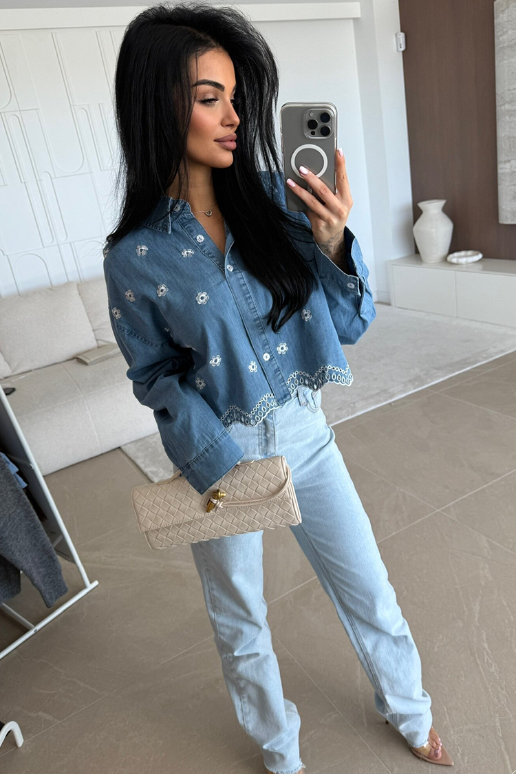 - Model ima duge rukave, ovratnik, kopča se gumbom i ima atraktivan cvjetni uzorak.