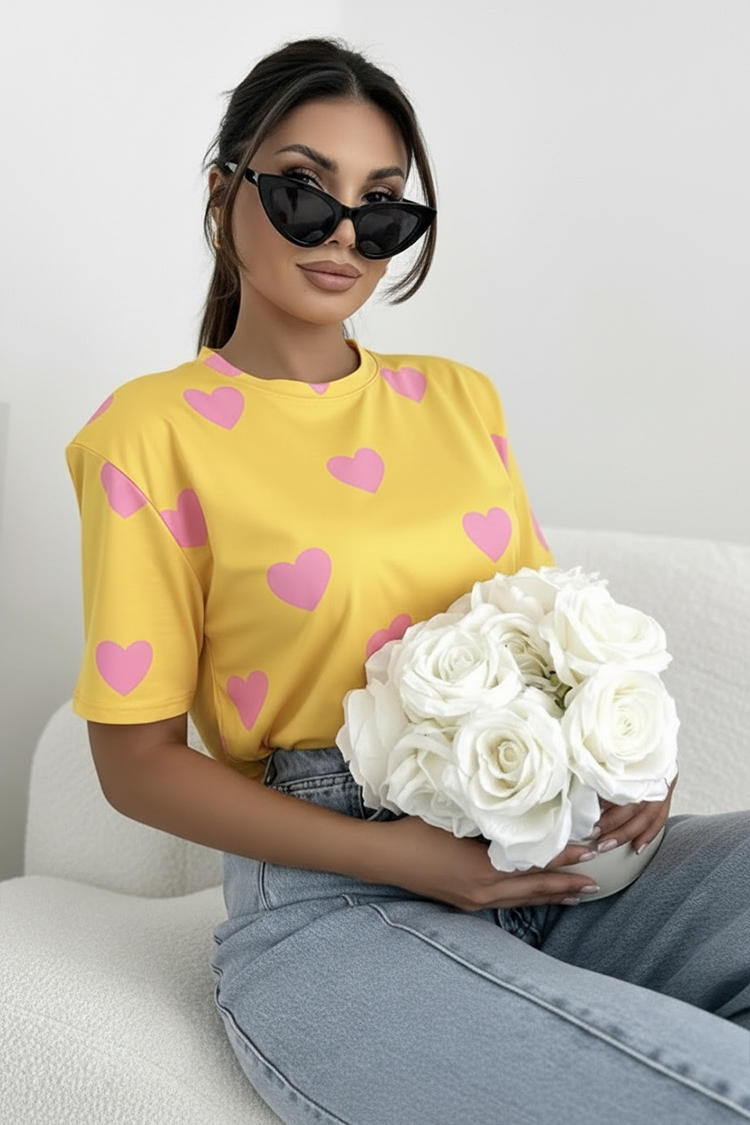 - Model ima kratke rukave, okrugli izrez, precizan kroj i uzorak srca.