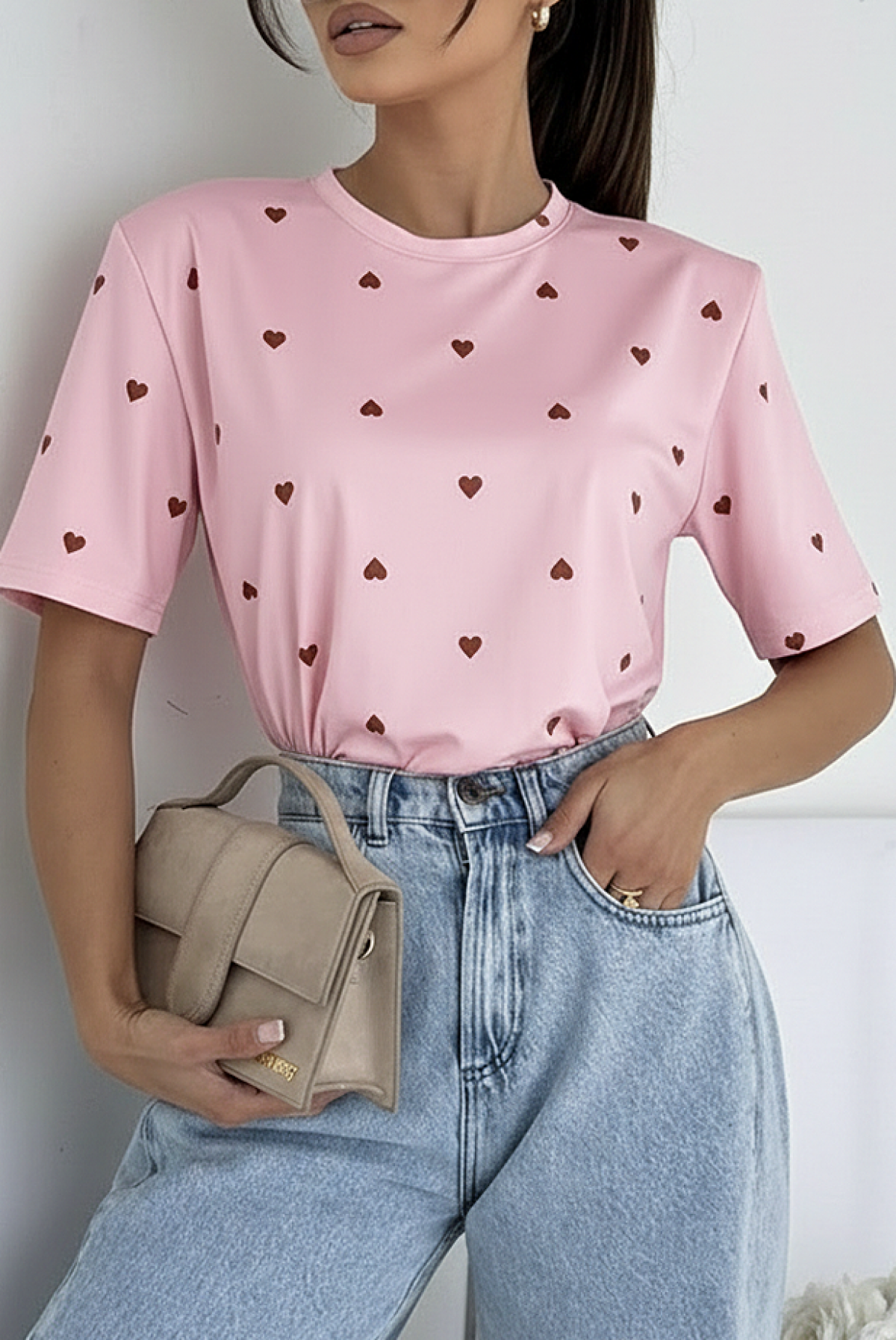 - Model ima kratke rukave, okrugli izrez, precizan kroj i uzorak srca.