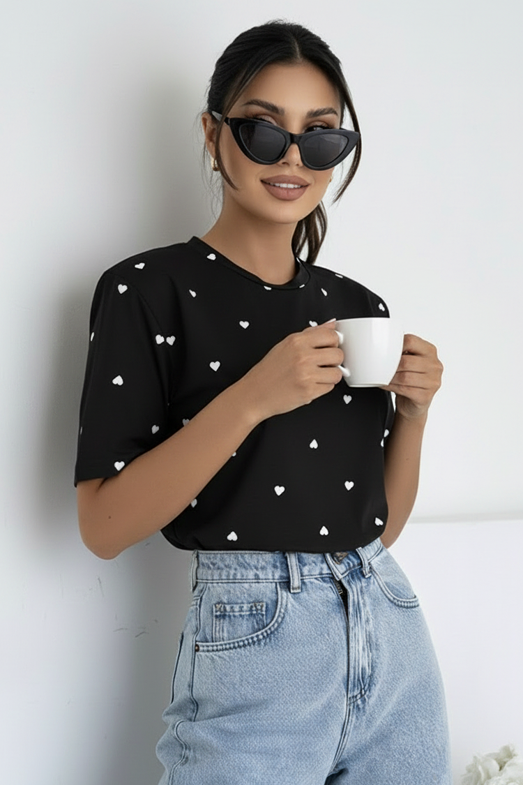 - Model ima kratke rukave, okrugli izrez, precizan kroj i uzorak srca.