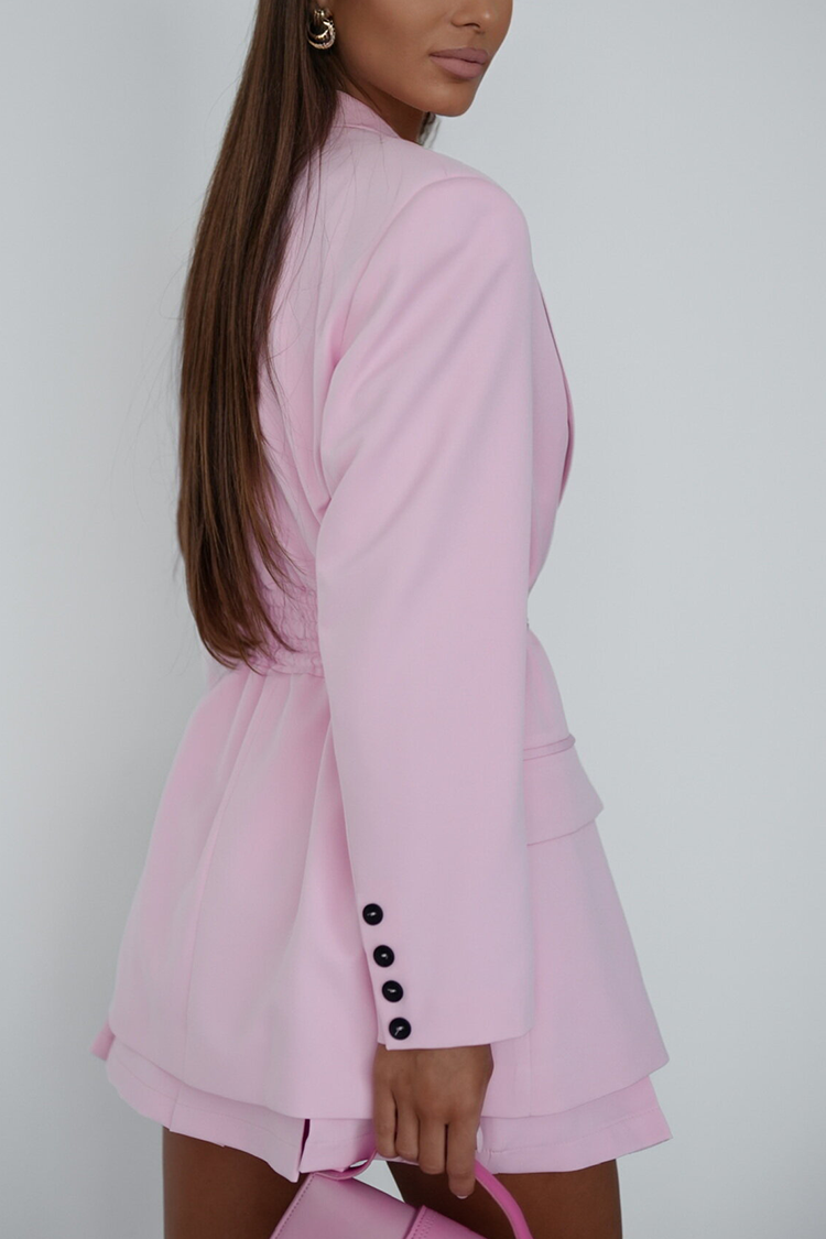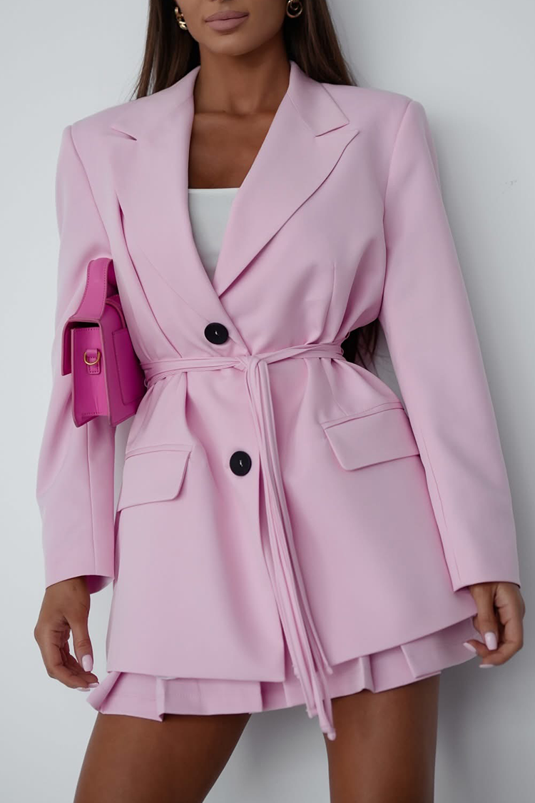 - Sako ima klasičan kroj, ovratnik, gumbe, bočne džepove i remen izrađen od iste tkanine.