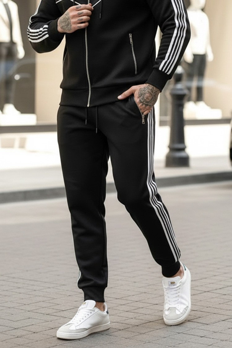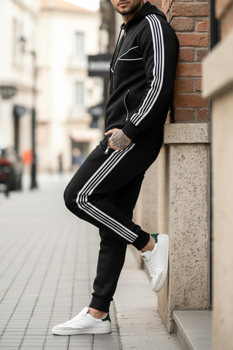 - Udoban muški dvodijelni set u crnoj boji s kontrastnim ukrasnim linijama, koji se sastoji od dukserice s kapuljačom i hlača.
