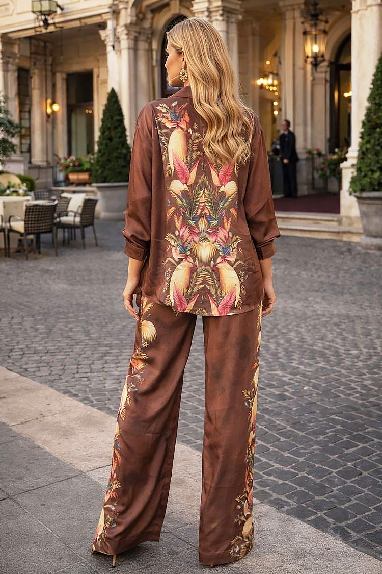 - Svakodnevni satenski ženski dvodijelni set s višebojnim uzorkom.