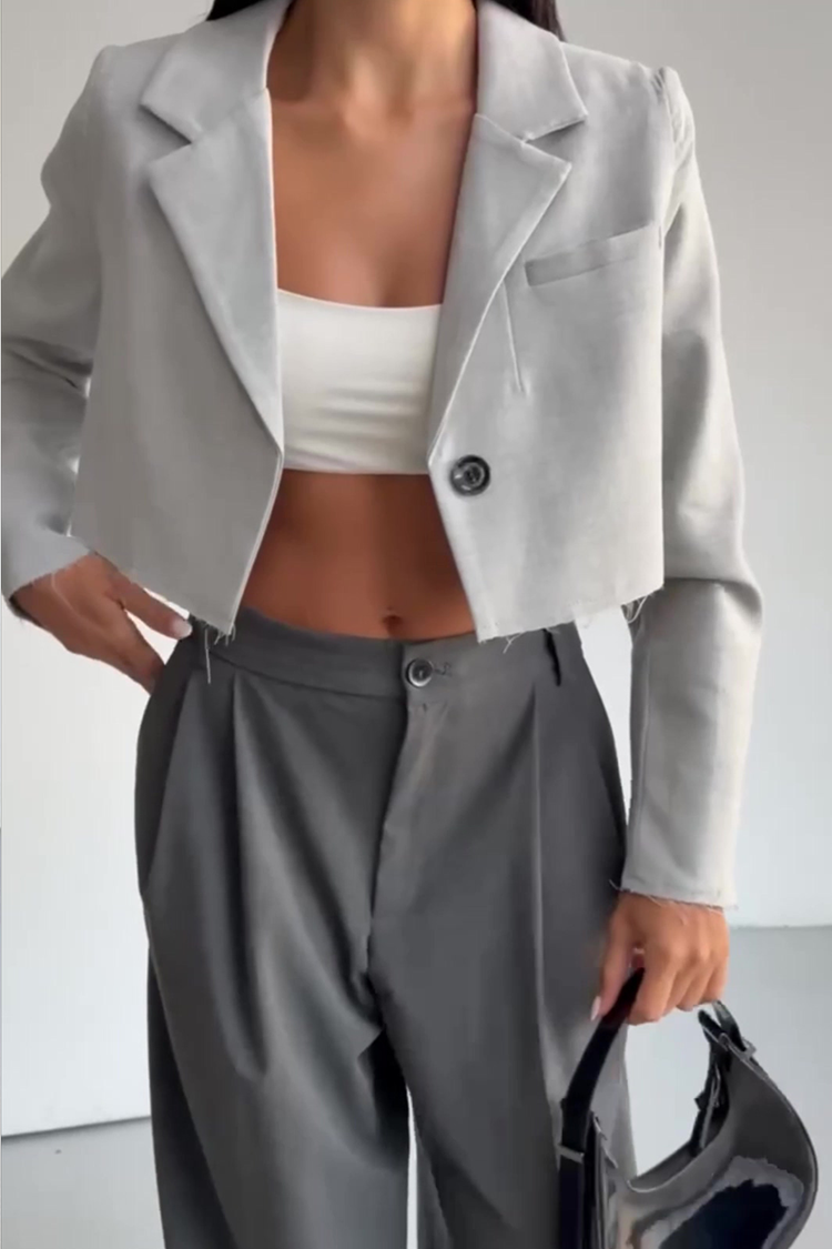 - Model ima kratku duljinu, jednobojni uzorak, ovratnik i kopčanje na gumb sprijeda.