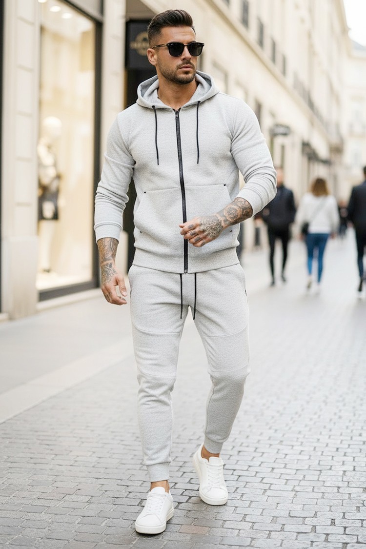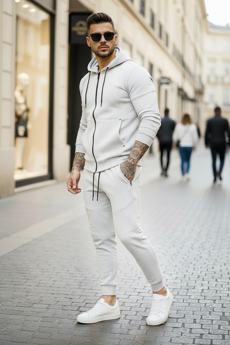 - Praktični muški dvodijelni set koji se sastoji od dukserice s kapuljačom i hlača u svijetlo sivoj boji.