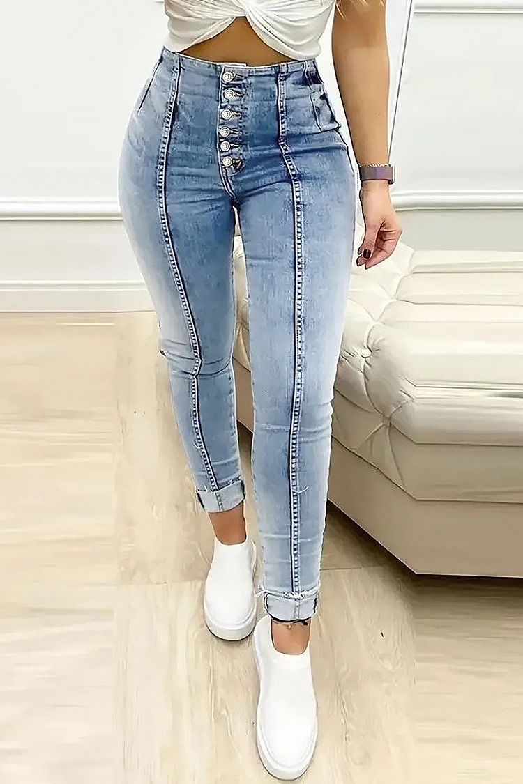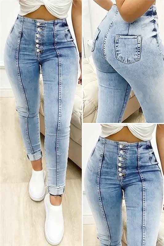 - Model ima visoki struk, pripijeni kroj, bočne džepove i gumbiće.