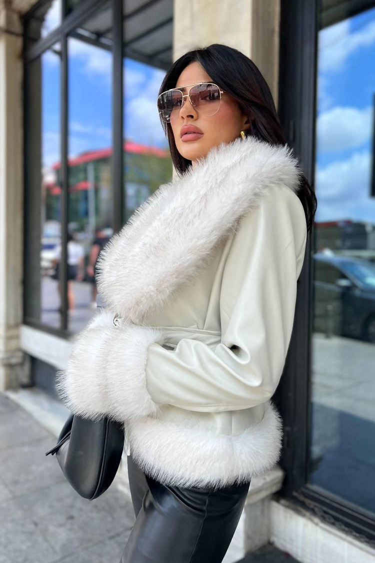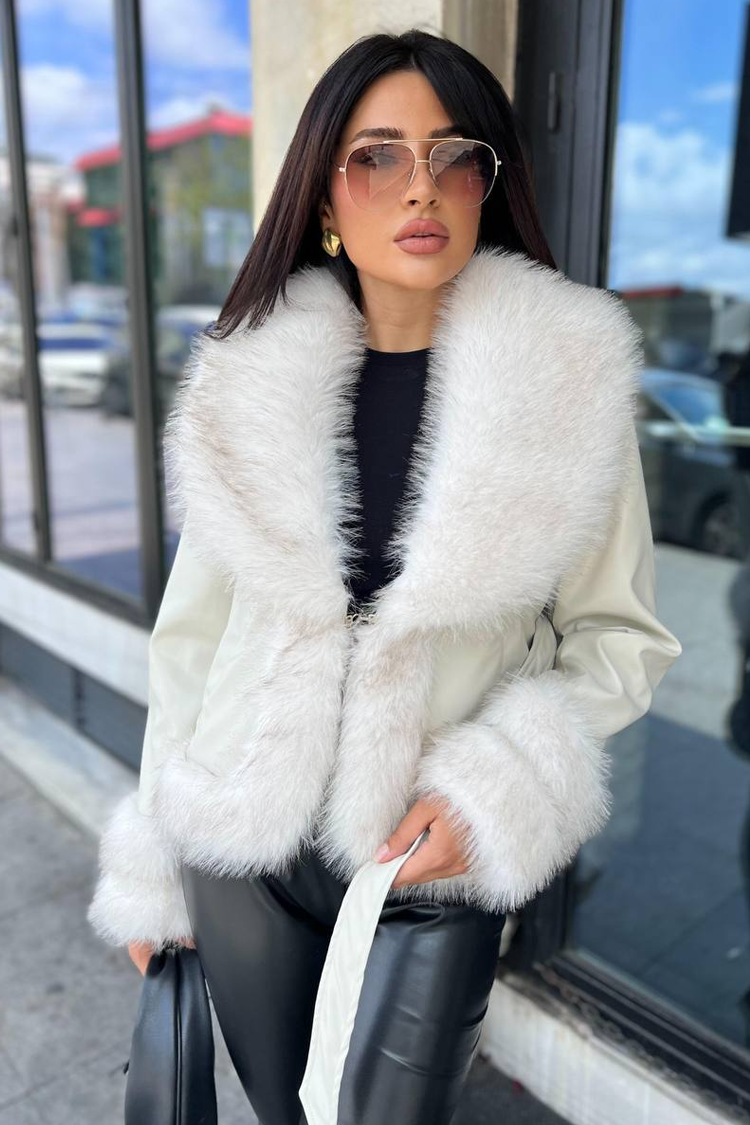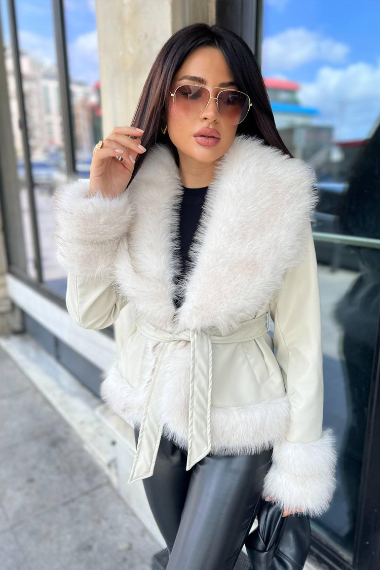 - Model je izrađen od eko kože, voluminoznog ovratnika s krznom, ecru boje i remena od iste tkanine.