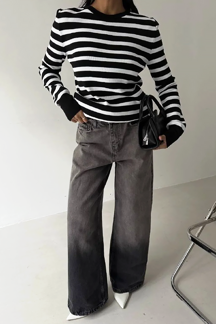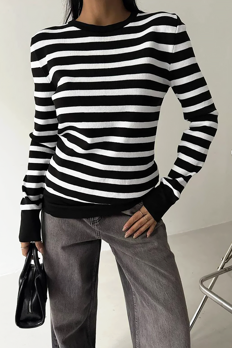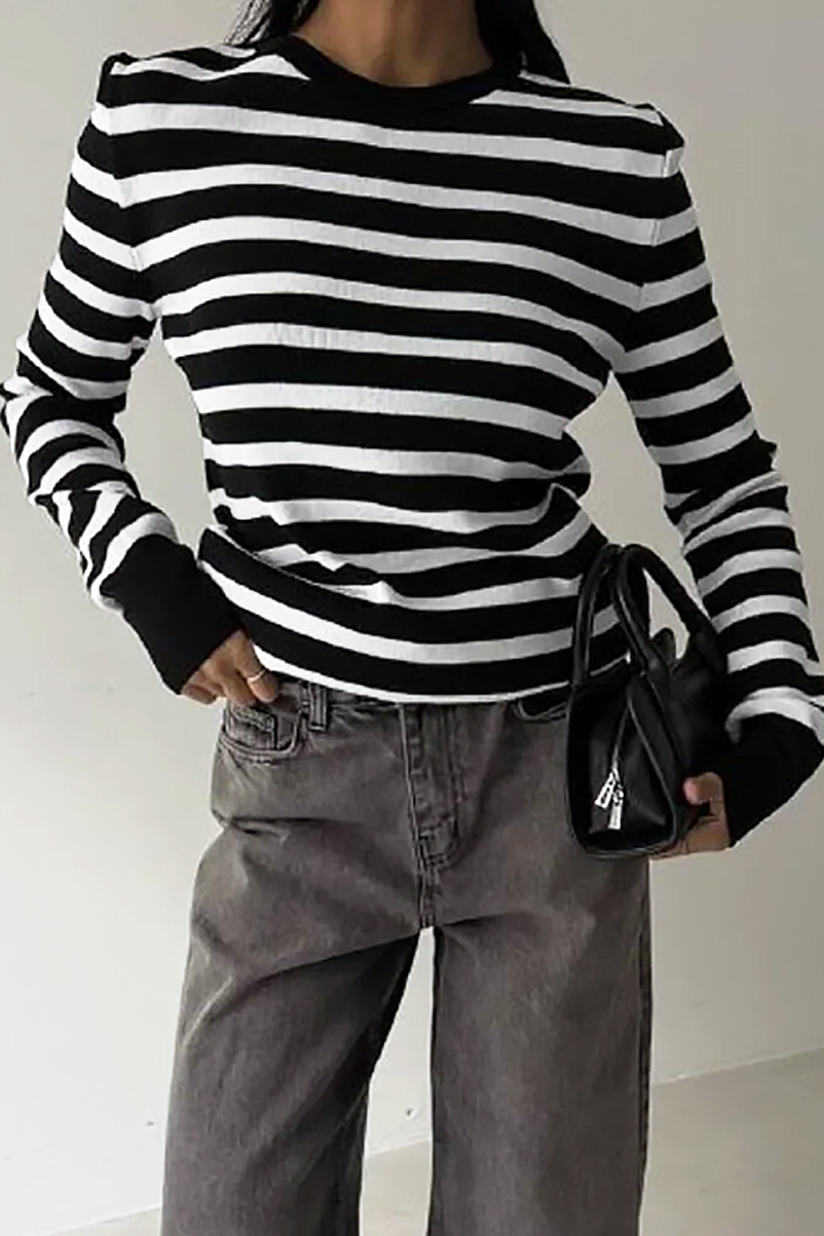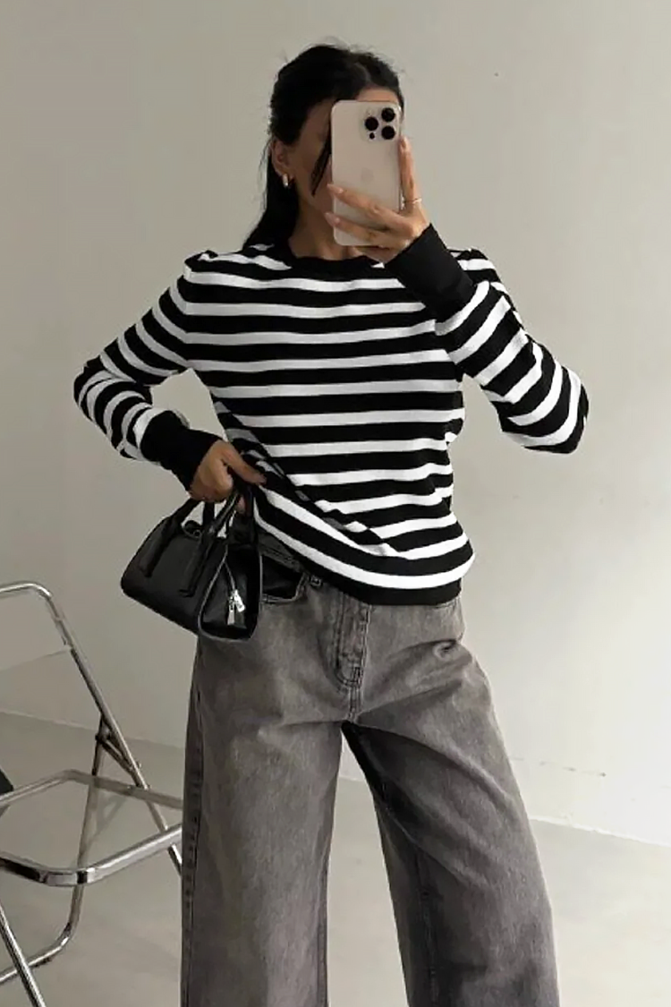 - Model ima duge rukave, klasičan kroj i prugasti uzorak.