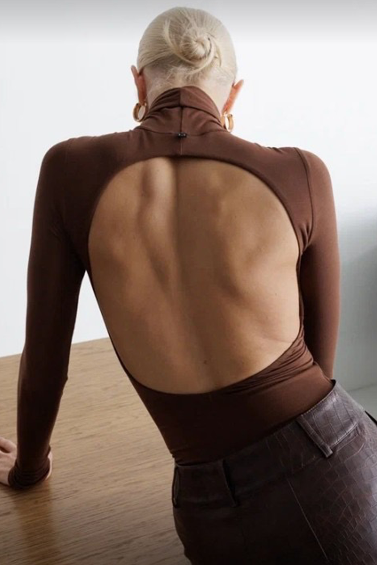- Model ima visoki ovratnik i impresivan izrez na leđima.