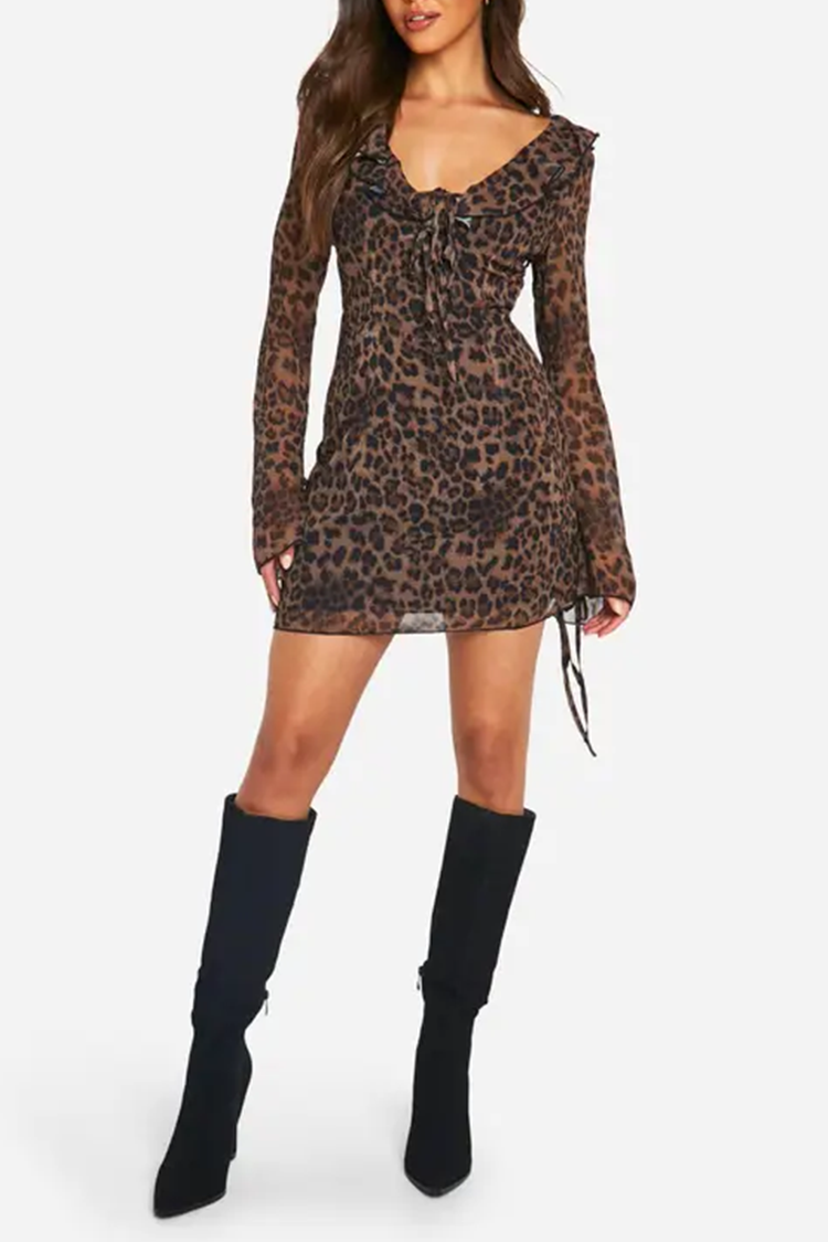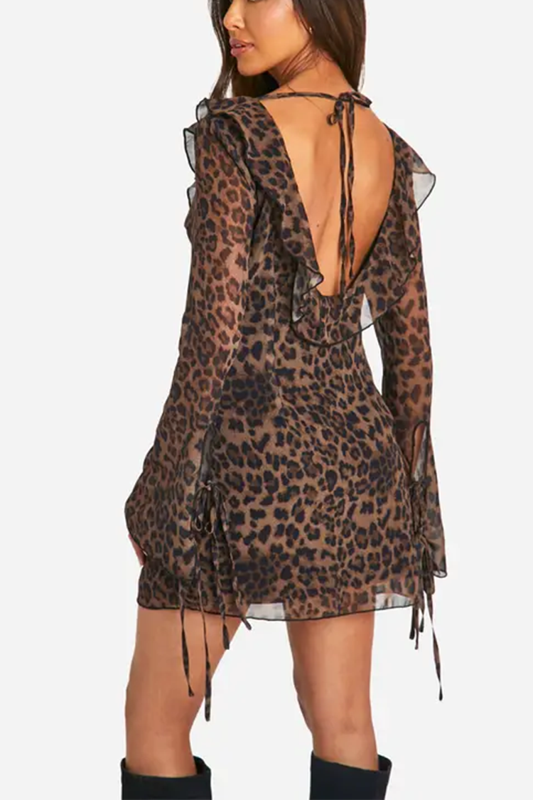 - Haljina ima atraktivan kroj, leopard print, duge rukave i vezice.