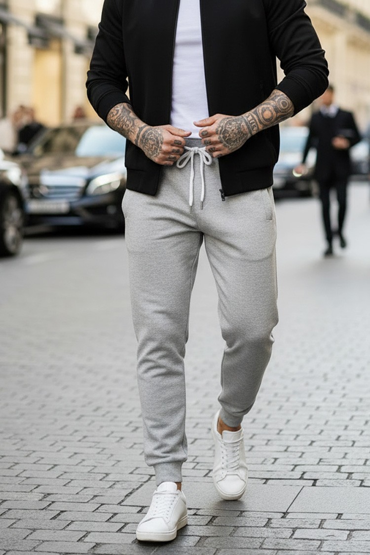 - Muške sportske hlače čistog dizajna u sivoj boji, izrađene od pamučne tkanine.