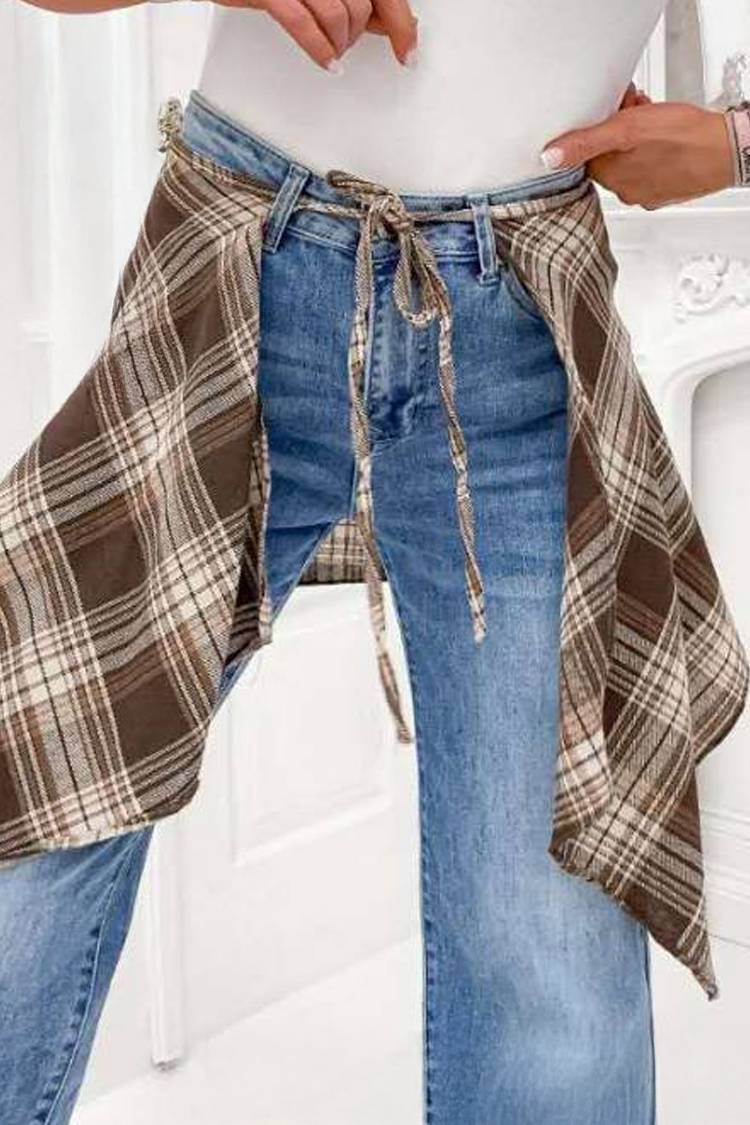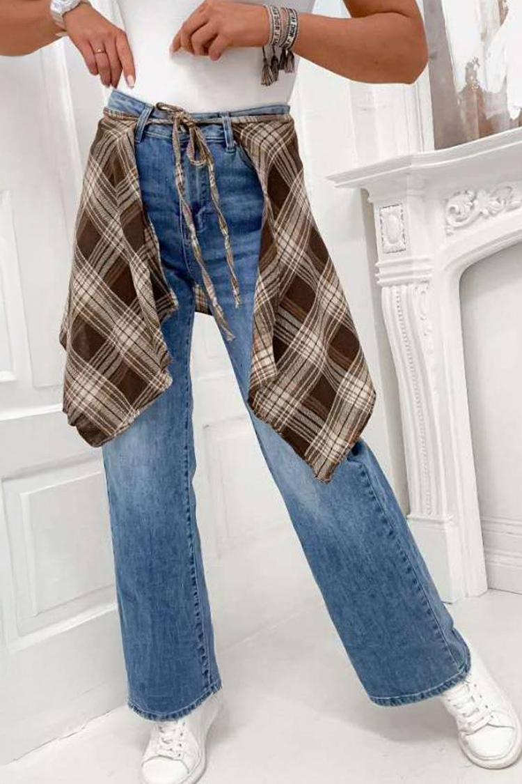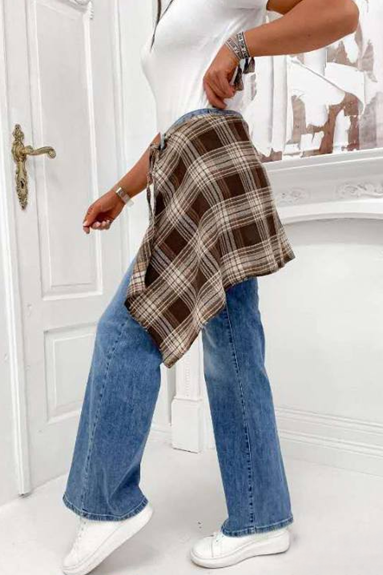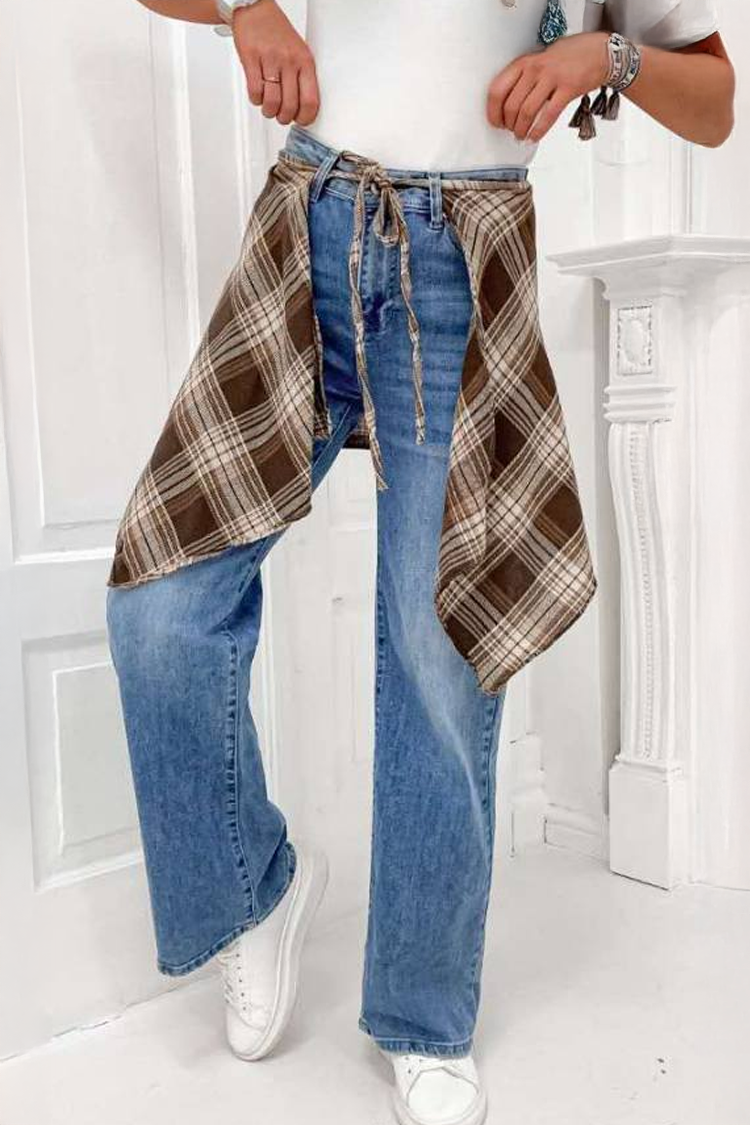 - Model ima visoki struk, široke nogavice, bočne džepove i atraktivan šal s kariranim uzorkom.
