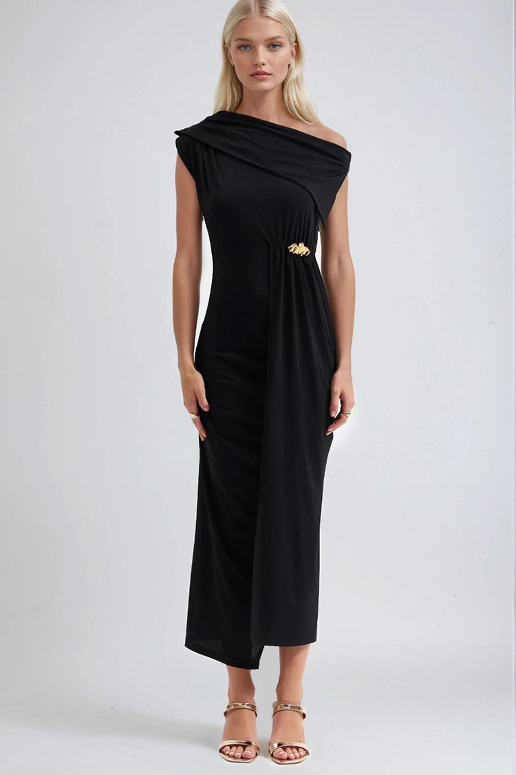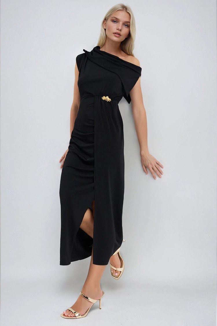 - Model ima elegantan kroj, metalni detalj sprijeda, prorez i asimetrični dekolte.