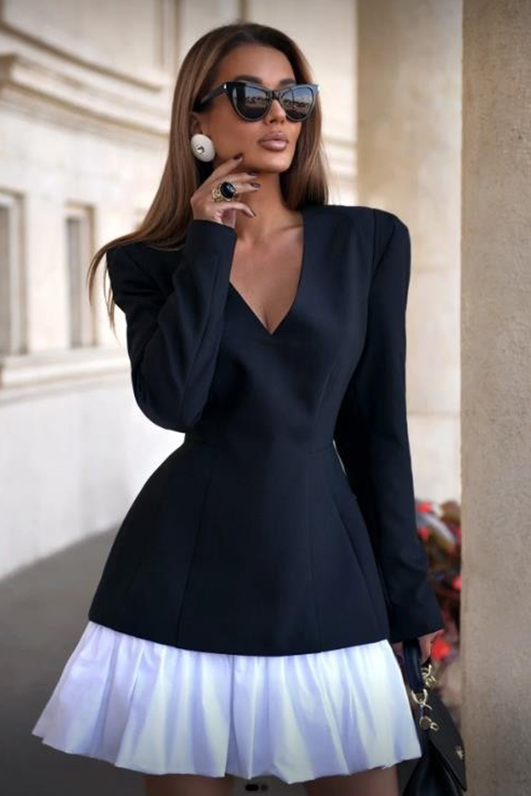 - Model ima duboki V-izrez, duge rukave i klasične boje.