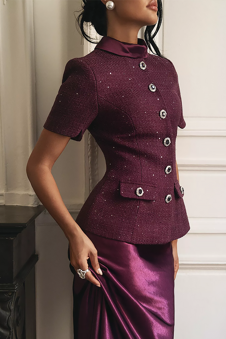 - Sako ima spektakularne gumbe sprijeda, ukrasne džepove i kratke rukave.