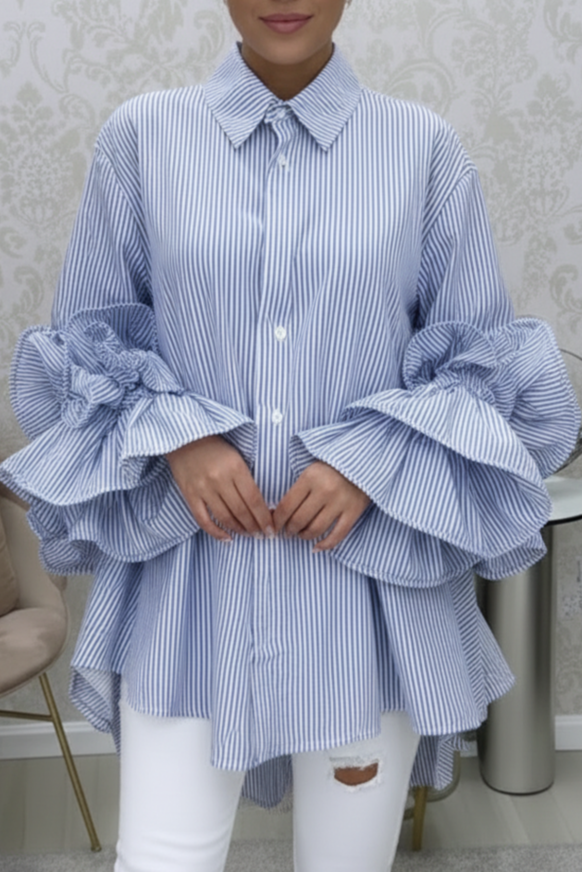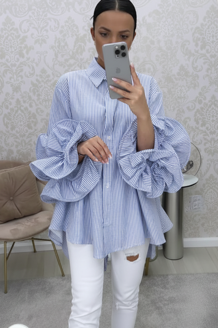 - Model ima gumbe cijelom duljinom, spektakularne volane i prugasti uzorak.