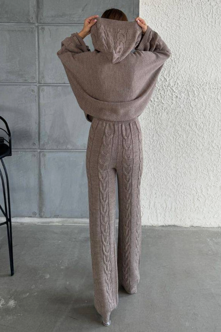 Dukserica ima široki kroj i kapuljaču, a hlače imaju zvonasti dizajn i visoki struk.