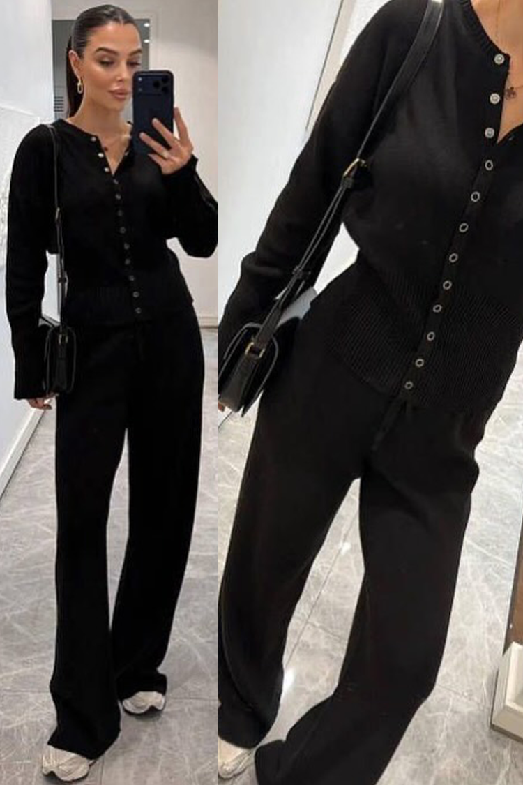 - Kardigan ima klasičan kroj i gumbe, a hlače udoban dizajn i visoki struk.