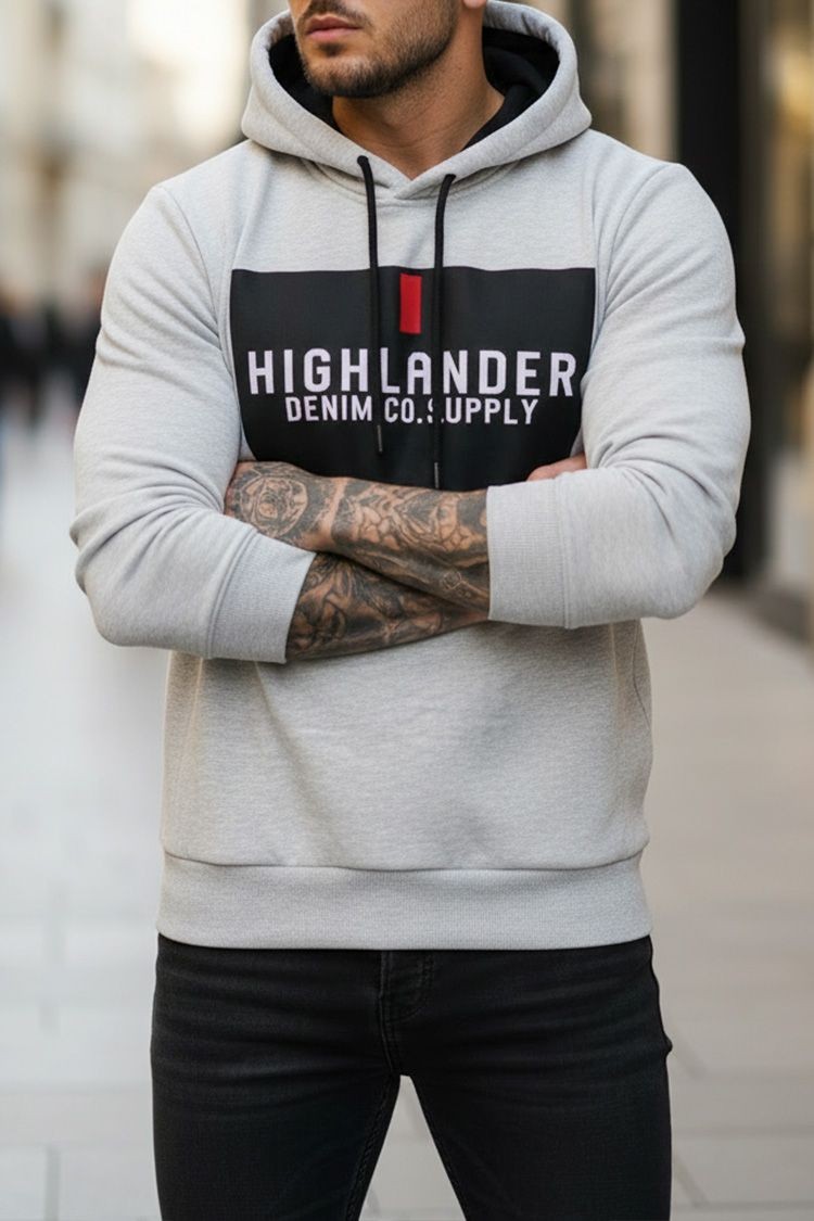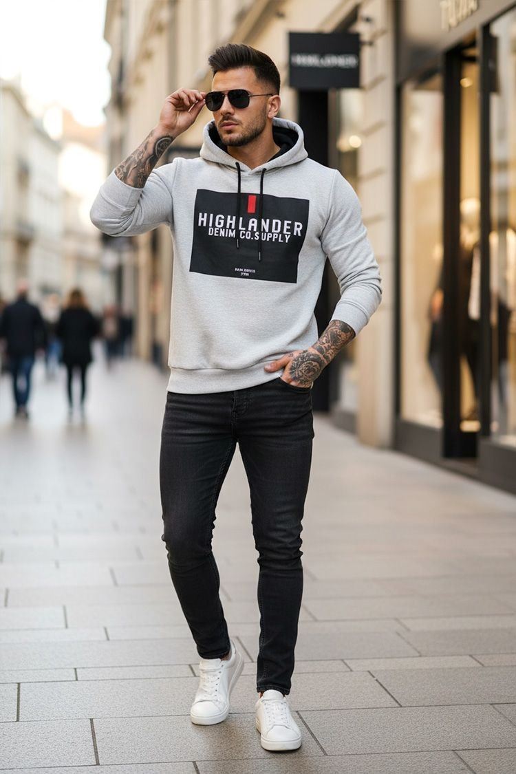 - Trendovna muška dukserica s printom u svijetlosivoj boji, prikladna za svakodnevni život, sport ili šetnju.
