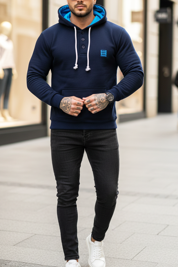 - Praktična muška dukserica s gumbima na dekolteu i kapuljačom s vezicama, prikladna za svakodnevni život ili šetnju.