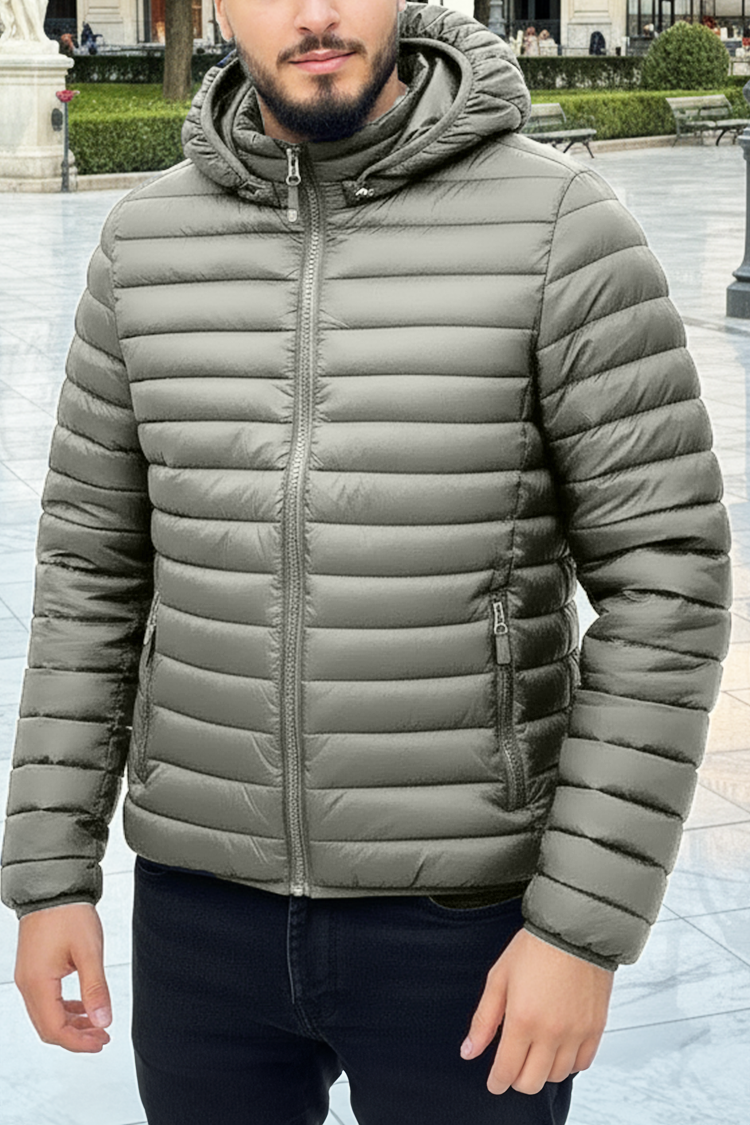 - Udobna muška jakna s horizontalnim prošivenim dizajnom i odvojivom kapuljačom u žutoj boji sa sportsko-svakodnevnim stilom.